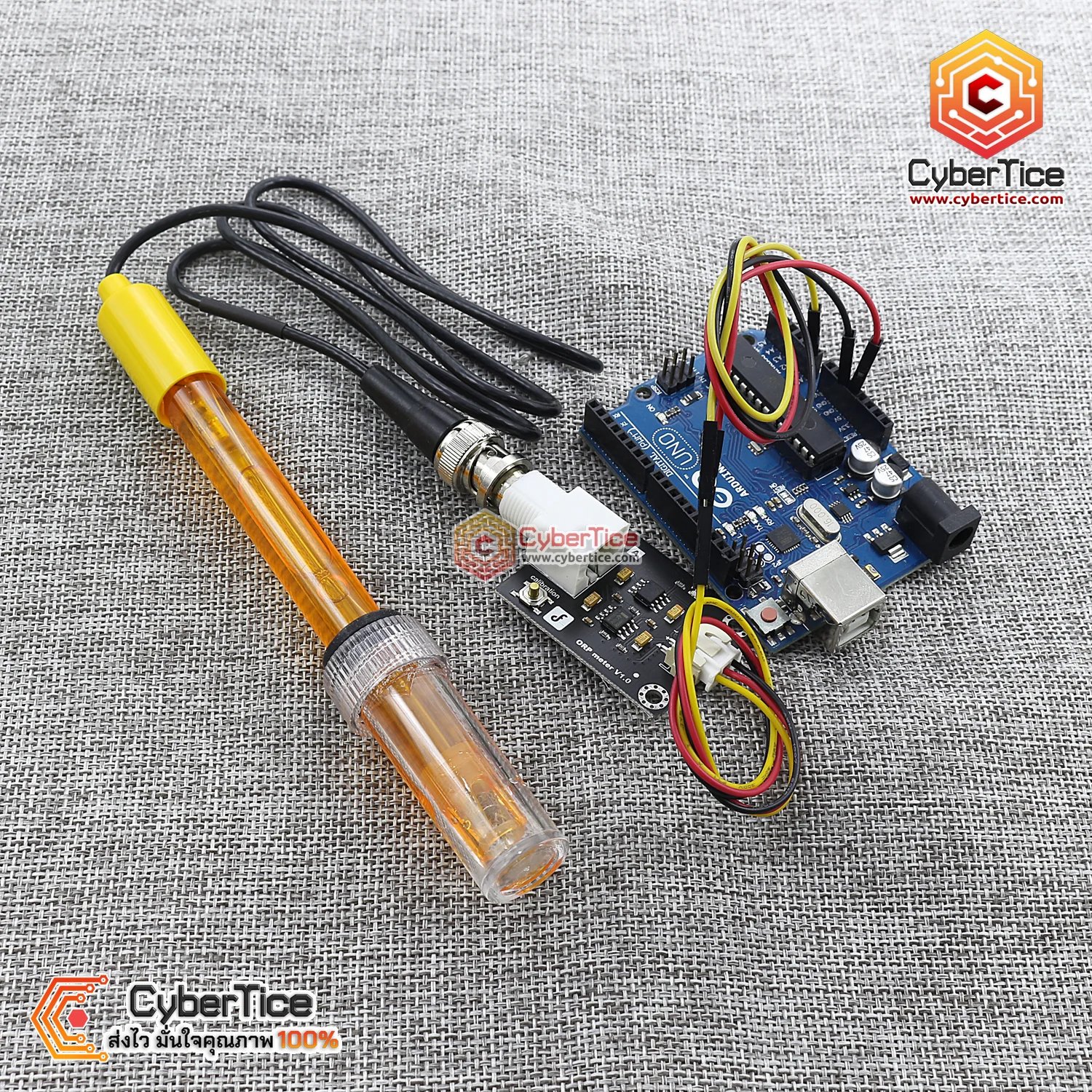 التالي: ● القطب (ORP Probe): وهو الجزء الذي يُغمس في الماء، وينتهي بوصلة BNC. ● لوحة المعالجة (Circuit Board): تحول الإشارة الضعيفة من القطب إلى إشارة تماثلية (Analog) يفهمها الأردوينو. ● كابل التوصيل: للربط بين اللوحة ومنفذ الـ Analog في الأردوينو.