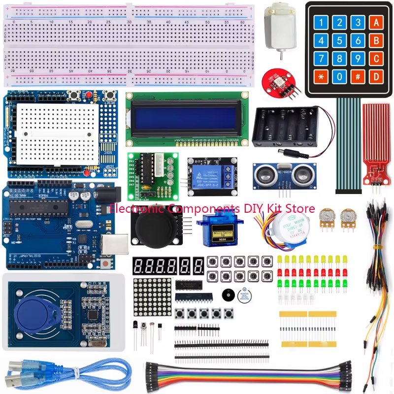 Product Description 5V stepper motor 1 5V stepper motor driver board a 1602LCD screen a Tri-color SMD 1 Big button 10 Plug-in rushing (green bread plate) 1 Level 1 Bread Line * 35 Small button 5 Infrared receiver element 1 LM35 element 1 Fire element 1 Switch element 1 The photosensitive member 1 RFID blue plate 1 Key 1 1 * 8 pin 1 5K adjustable potentiometer 1 HHC small motor 1 SR04 Ultrasonic 1 Four digital tube 1 A digital tube 2 8 * 8 dot matrix 1 F5 LED White 6 F5 LED yellow 10 F5 LED Green 10 F5 LED red 10 Black rocker 1 F UNO R3 1 White card 1 USB cable 1 Active buzzer element 1 Passive buzzer element 1 10K adjustable potentiometer 1 MAX7219 IC 1 9 g servos 1 Single 5V relay 1 1 * 40 straight needle 1 1 * 40 looper 1 Female-female DuPont line 10 / row 1 830 holes Breadboard 1 6 on the 5th battery box 1 595IC 1 4 * 4 membrane keys 1 1K 5 10K 5 220R 8