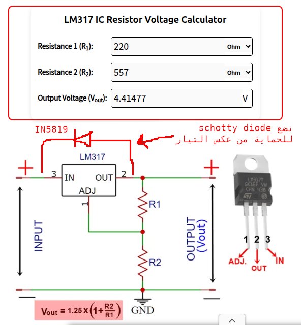 - الافضل استخدام محول 9 فولت او 12 فولت مع مقاومات 220 و520 للحصول على مخرج 4.2 فولت