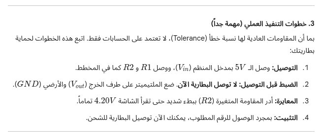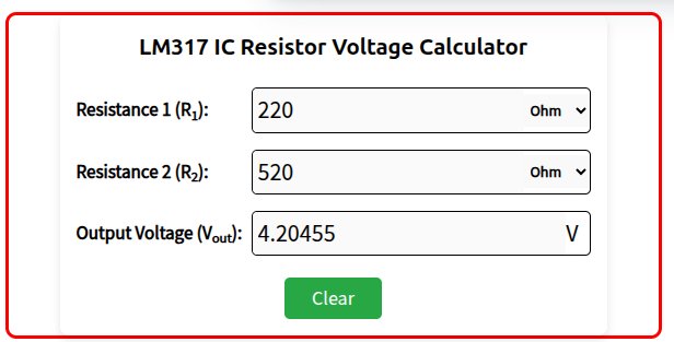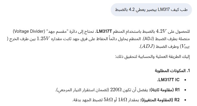 - الافضل استخدام محول 9 فولت او 12 فولت مع مقاومات 220 و520 للحصول على مخرج 4.2 فولت
