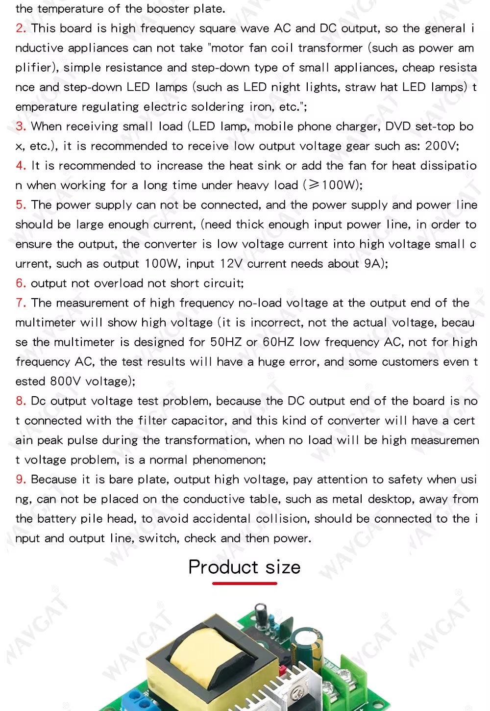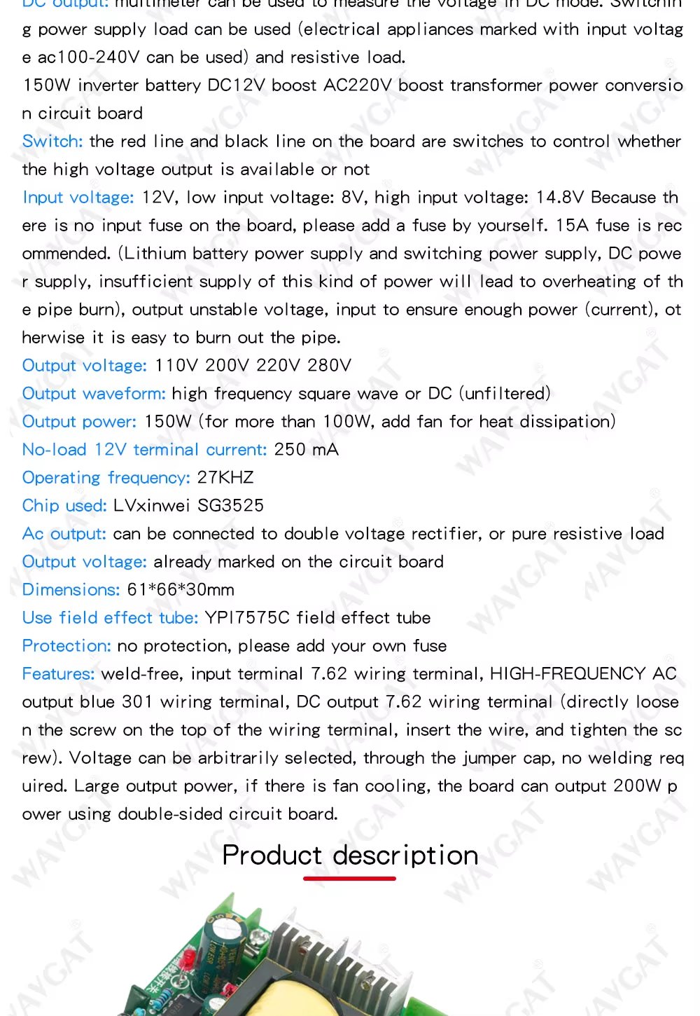 Dissipation Power: 150Wn3dB Bandwidth: DC-AC ConverternStorage: Electronic experimentnOperating Temperature: -40℃ ~ +85℃n105℃ Volatile Materials: ≤WAVGATnPackage: Smart ElectronicsnCustomization: Yesnnn|Wavgat Module|nn**High-Performance Conversion**nThe WAVGAT 150W DC-AC Converter Booster module is a versatile and robust solution for power conversion needs. With a dissipation power of 150W, it is designed to efficiently convert DC voltage to AC, ensuring a stable and reliable power supply for your electronic devices. The 3dB bandwidth of this module allows for a wide range of applications, from industrial equipment to consumer electronics. The operating temperature of -40℃ to +85℃ makes it suitable for use in extreme environments, while the 105℃ volatile materials ≤WAVGAT guarantee durability and reliability.nn**Versatile Application and Customization**nThis module is not just a power converter; it's a tool for electronic experimentation and smart electronics projects. Its compact size and smart packaging make it a valuable addition to any inventory. The customization option allows for tailored solutions to meet specific project requirements, making it an indispensable asset for professionals and hobbyists alike. Whether you're looking to power a project in your lab or enhance the performance of your electronic devices, the WAVGAT 150W DC-AC Converter Booster module is the perfect choice.nn**Reliable and Adaptable Design**nThe WAVGAT 150W module is not just about power; it's about reliability. Its smart design ensures that it operates efficiently and effectively, with minimal heat dissipation. The electronic experiment storage feature makes it a valuable asset for those involved in research and development. The module's ability to adapt to a wide range of scenarios, from industrial applications to consumer electronics, makes it a versatile and indispensable tool for anyone involved in power conversion. With its robust build and customization options, it's a reliable companion for any project that demands high-quality power conversion.