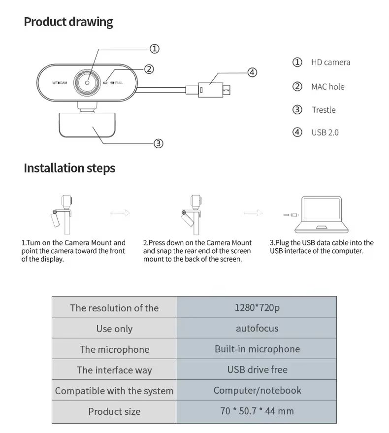 • High Definition 1080P Camera :Experience superior video quality with the 1080P HD camera, perfect for crystal-clear web conferencing or surveillance. • Built-in Microphone :Equipped with a built-in microphone, this webcam allows for hands-free communication, making it ideal for video calls or online classes. • USB Plug and Play :This camera is designed for easy usage with its USB plug and play feature, no separate software installation required. • Network Connectivity :With its network capabilities, this camera can be accessed from anywhere, making it a great choice for remote monitoring or virtual meetings. • Tripod Stand :The included tripod stand provides flexibility and stability, ensuring high-quality, clear images regardless of the shooting angle. • Origin : Mainland China 【High Resolution :】Capture clear and detailed images with a maximum resolution of1920x1080. 【Built-in Microphone :】Experience high-quality audio with the built-in microphone thatcaptures crisp and clear sound. 【USB Network Camera :】Connect to your network via UsB and enjoy the freedom ofstreaming your webcam's feed to any device. 【Easy to Use :】With no complicated setup required, simply plug in the camera and startusing it right away.