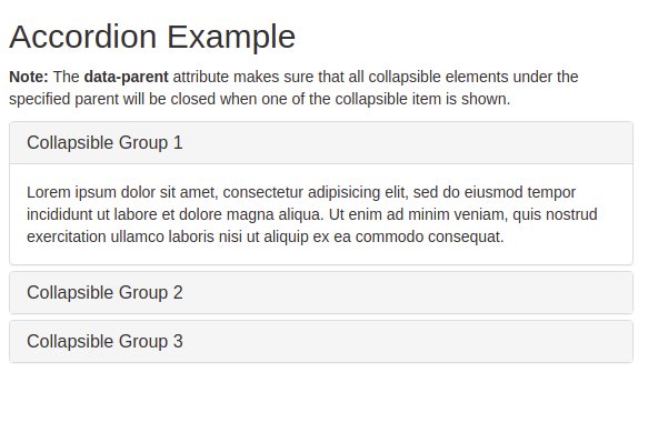 <p><strong>Note:</strong> The <strong>data-parent</strong> attribute makes sure that all collapsible elements under the specified parent will be closed when one of the collapsible item is shown.</p>