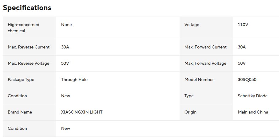 30SQ050 Schottky Diode 30A 50V Axial for Solar Panel Parallel Reflow Protection