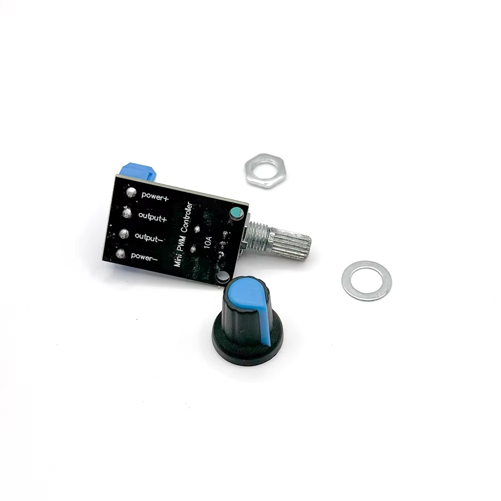 Max voltage: 16V Minimum voltage: 5V Continuous current: 10A Short maximum current: 20A (less than 10 seconds) Speed control mode: PWM stepless speed regulation, can also be used to adjust the light Control mode: speed control potentiometer (clockwise clicked open, continue to rotate clockwise from 1% to 99% speed) Duty cycle: 0%-99% (0% position is the state of the switch off when the potentiometer is most on the left). When the current is switched on, the 0.002A (long time no need to switch off the governor is no current). Efficiency: the maximum efficiency is as high as 98%. Volume: long 3cm (excluding potentiometer), wide 2cm, high 1.4cm If you are using the speed control (dimming) to do the product, the shop can provide free Custom service, can be in accordance with the requirements of the customer to modify the shape of the circuit board, installation Mode, current and voltage parameters, add other functions, etc Note that the governor is mainly used in motor speed control, if you are used to LED dimming, must ensure that the LED can also work in direct power supply, the dimming range of the speed governor is from LED to LED directly connected to the power supply is completely extinguished between dimming, if LED is directly connected with a power that will burn through dimmer the dimming is burned, which typically requires a series current limiting resistor, if you don't know how much resistance can contact customer service.
